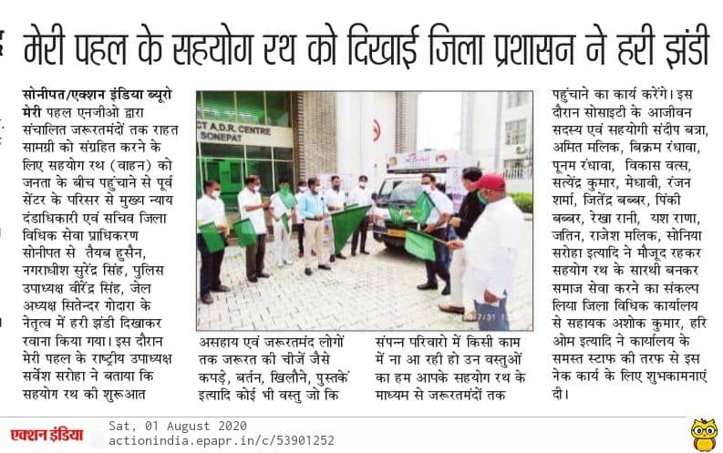 सोनीपत। 'सहयोग रथ' को आज A.D.R. सेंटर के परिसर से हरी झंडी दिखाकर रवाना किया गया, जिसके अंतर्गत मेरी पहल NGO ने जरूरतमंदों तक राहत सामग्री पहुंचाने का कार्य आरंभ किया है। इस समारोह की अगुवाई मुख्य न्याय दंडाधिकारी और सचिव जिला विधिक सेवा प्राधिकरण सोनीपत, माननीय तैयब हुसैन, नगरधीश सुरेंद्र सिंह, पुलिस उपाध्यक्ष वीरेंद्र सिंह और जेल अध्यक्ष सितेंद्र गोदारा ने की, जिन्होंने इस रथ को जनता के बीच भेजा।