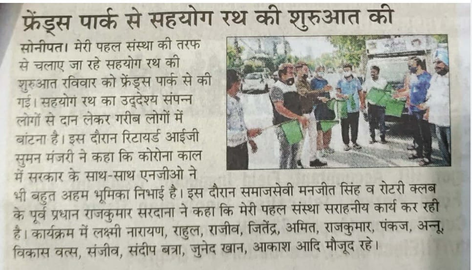 मेरी पहल संस्था ने वार्ड संख्या 17 और फ्रेंड्स पार्क में सहयोग रथ की औपचारिक शुरुआत की। इस रथ का उद्देश्य समाज के संपन्न वर्ग से कपड़े, बर्तन, खिलौने और अन्य उपयोगी सामग्रियों को एकत्रित करके उन्हें जरूरतमंद लोगों तक पहुंचाना है। इस पहल को स्थानीय समाजसेवियों और अधिकारियों द्वारा बहुत सराहा गया। पूर्व आईजी श्रीमती सुमन मंजरी ने कहा कि कोरोना के दौरान एनजीओ ने सरकार के सहयोग से महत्वपूर्ण भूमिका निभाई है, और मेरी पहल संस्था ने सैकड़ों परिवारों की मदद की है।